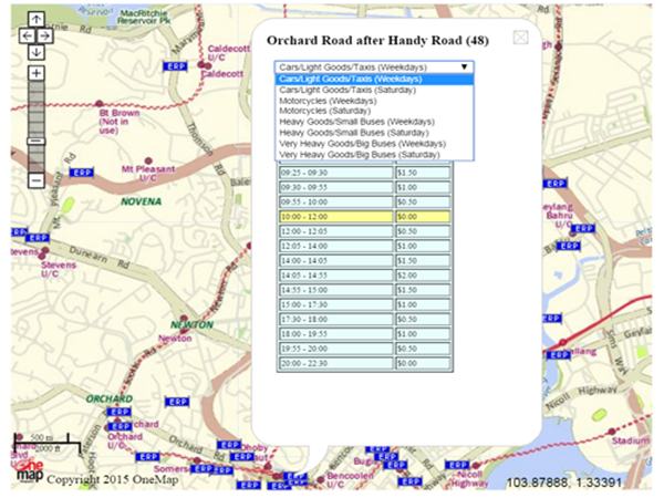 以安装在最繁华的旅游购物街乌节路上的一个电子收费闸门为例,通过该闸门的车辆按汽车/轻型货车/出租车、摩托车、重型货车/小型巴士、超重型货车/大巴的分类收费,同一类型车辆工作日和周末收费标准不同,每天不同时段也不同。