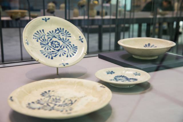 值得一提的是,此次展出的藏品包括一件中亚伎乐纹八棱金杯,是迄今发现的最大的唐代金杯(上图)。展出的三个兼具中东和中国特色的完整青花瓷盘(下图),表明当时中国制造的瓷器已开始吸收中东市场的审美元素。