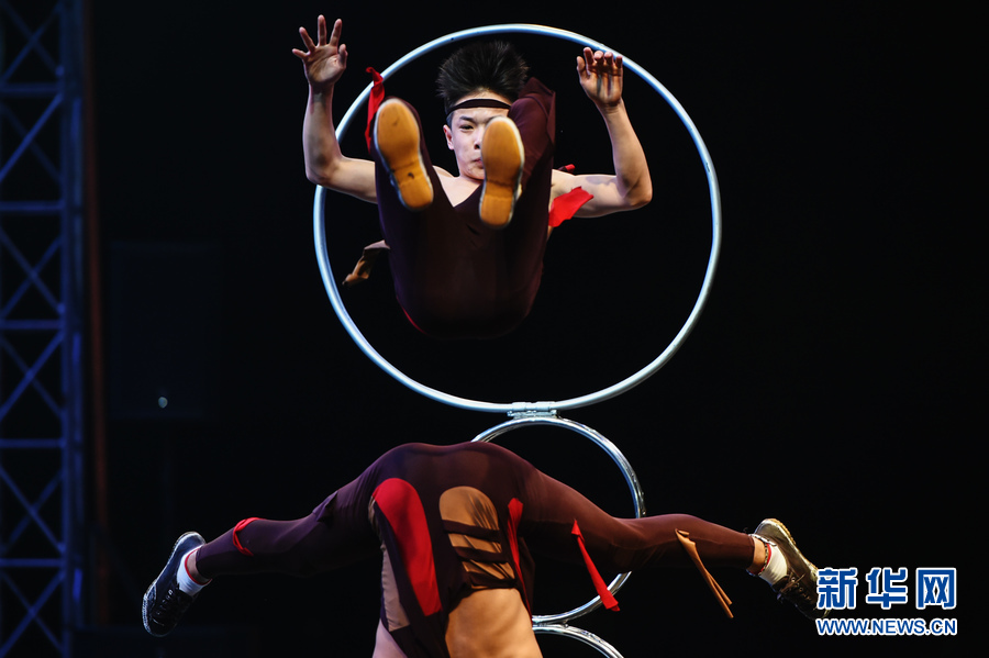 2月20日,来自中国山东省杂技团的演员在泰国曼谷表演钻圈。新华网记者李芒茫摄
