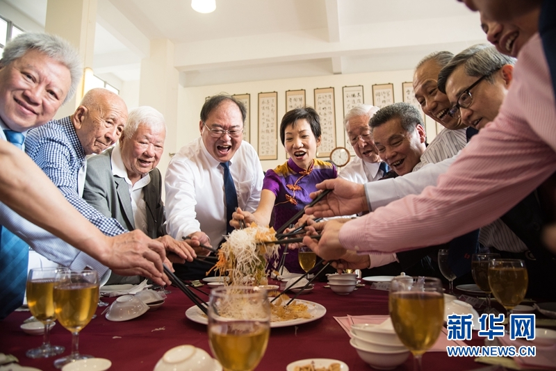 2月21日,新加坡文化、社区及青年部傅海燕部长(左五)、南安会馆陈奕福会长(左四)等嘉宾在活动现场捞鱼生。当日,新加坡南安会馆在新加坡南安会馆礼堂举行新春团拜会暨南安会馆第五十四届理事宣誓就职典礼。王应耀 摄