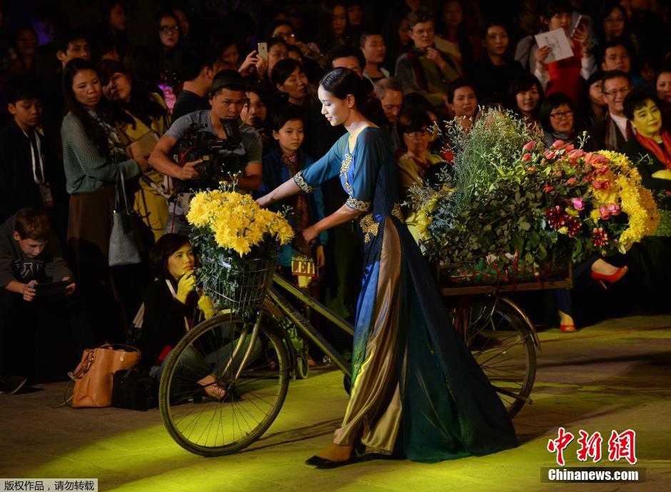 当地时间2016年3月4日,越南河内举行“袄代”装时尚展。模特穿传统服饰款款而来,在花丛中穿行,别具特色。