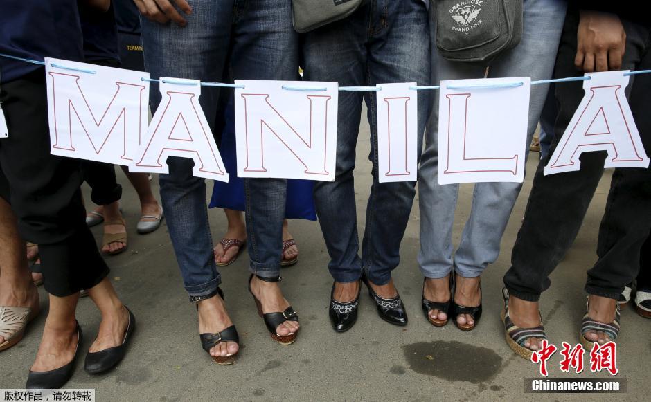 当地时间2016年3月7日,菲律宾马尼拉奎松市,国际妇女节前一天,男学生穿女鞋集会。