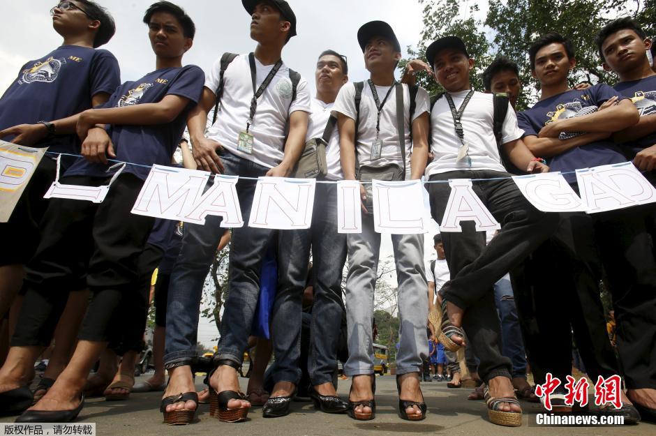 当地时间2016年3月7日,菲律宾马尼拉奎松市,国际妇女节前一天,男学生穿女鞋集会。
