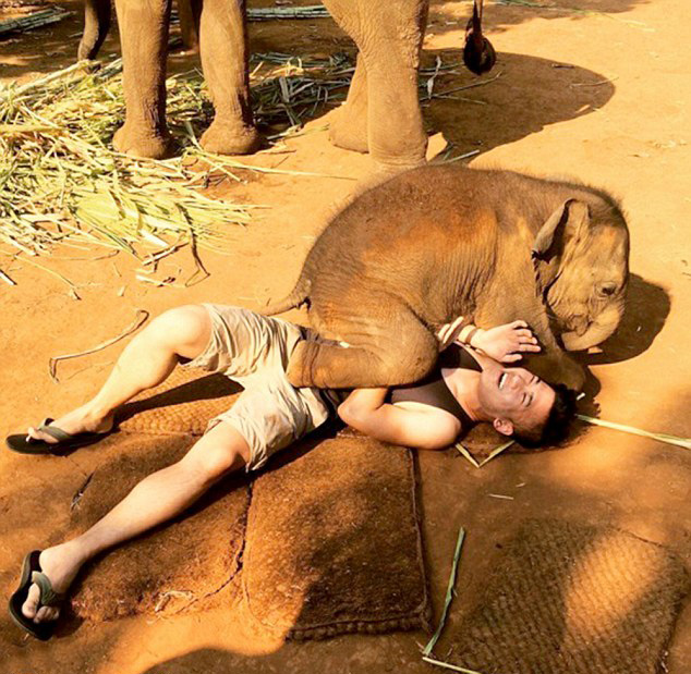 据悉,这头热情的小象名叫Nampuu,在泰语里是喷泉的意思。从游客拍摄到的照片中可以看到,小象把腿放在了游客身上,并且用鼻子环绕在游客的头部,游客们既开心又害怕,引来阵阵欢愉的尖叫声。小象在和游客们玩耍互动的时候,象妈妈一直在旁边监督着。
