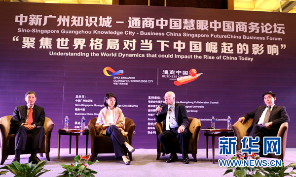 图为中新广州知识城-通商中国慧眼中国商务论坛沙龙环节。从左到右依次为:新加坡前交通部部长吕德耀,新加坡通商中国总裁孙雪玲,剑桥大学政治与国际关系学院高级研究员马丁·雅克,中新广州知识城投资开发有限公司总裁黄国祥。(王厚启 摄)