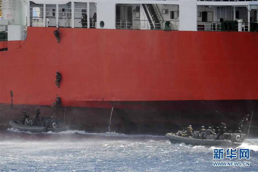 5月8日,新加坡反恐特遣部队人员在联合演习中进行登船解救行动。当日,来自文莱、泰国、韩国与新加坡的反恐特遣部队在东盟防长扩大会议海上安全与反恐联合演习第二阶段中,联合实施“海上风暴”行动,武力解救被劫持船舶“Avatar”号。新华社发(邓智炜摄)