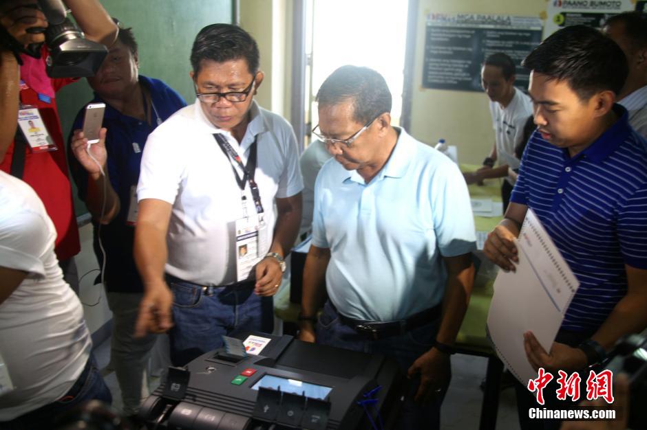 5月9日,菲律宾举行全国大选,全菲5400多万登记选民当天投票选举包括正、副总统在内的大批公职人选。图为9日早上六点多,菲律宾总统候选人、现任副总统比奈(中)与其儿子(右)一起在菲国金融中心城市马卡蒂市一处投票站点参加投票。比奈是五位总统候选人中当天最早参加投票的一位,吸引大批媒体到场关注。
