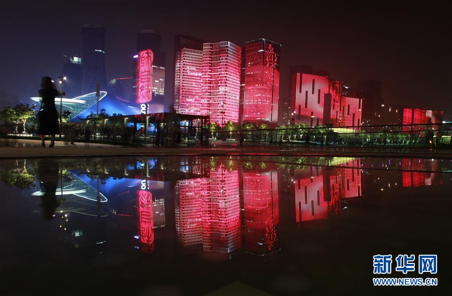 5月25日,市民在钱塘江畔欣赏夜景照明。为迎接G20峰会,杭州在西湖亮灯提升工程、运河亮灯提升工程后,又打造了钱塘江两岸夜景亮灯工程,从钱江一桥至钱江二桥之间的江水、堤岸、建筑等在五光十色、变幻多姿的灯光中,描绘出一幅“钱江夜曲”璀璨长卷。新华社记者邢广利摄