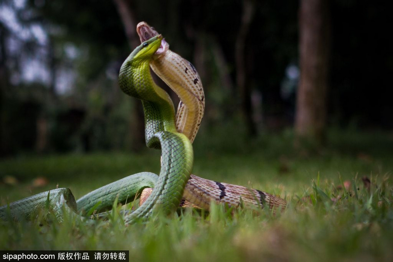 印尼人Krisdian Wardana在自家后院发现两条蛇在打架,便用相机记录下这激烈火爆的场面。一条是红尾绿色食鼠蛇,另一条是三索颌腔蛇。摄影师说这两条蛇可能是因为猎物和领地才大打出手。红尾绿色食鼠蛇常生活树上,很少下地面来。而另外一条棕色的蛇天生具有攻击性。Sipaphoto
