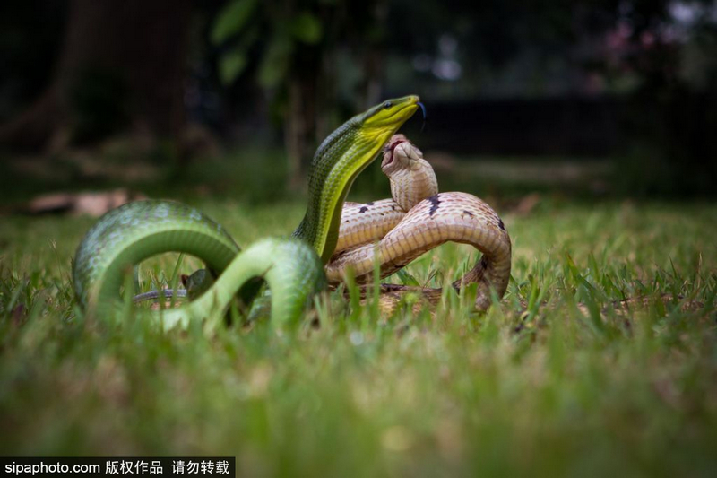 印尼人Krisdian Wardana在自家后院发现两条蛇在打架,便用相机记录下这激烈火爆的场面。一条是红尾绿色食鼠蛇,另一条是三索颌腔蛇。摄影师说这两条蛇可能是因为猎物和领地才大打出手。红尾绿色食鼠蛇常生活树上,很少下地面来。而另外一条棕色的蛇天生具有攻击性。Sipaphoto