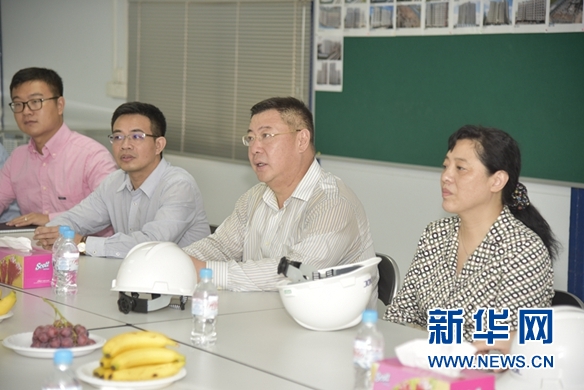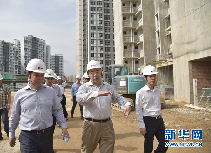 中国驻新加坡大使馆经济商务参赞处公使衔参赞郑超(左二)在青建国际(南洋)集团发展有限公司执行董事王林宣(左一)一行人的陪同下莅临施工现场指导工作。新华网发 王应耀 摄